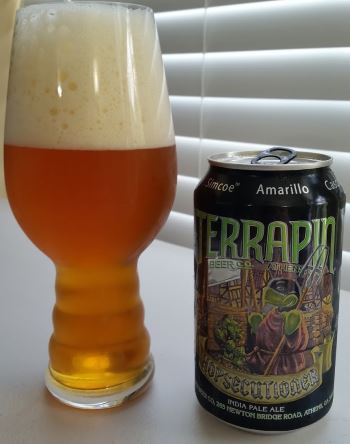 Hopsecutioner is an American IPA, and a rather big one, from Terrapin Beer Co out of Athens, Georgia. While it’s styled as an IPA, to my senses, its closer to what I’d identify as as Imperial IPA than a standard IPA. It is heavily hopped (with 6 varieties) but balanced, so lots of malty goodness as well which gives it that strong resemblance to an Imperial. The foam is light and full, but dissipates quickly. The nose has strong orange notes, a bit of caramel, and some licorice. The middle has some slight piney bitterness, balanced with sweet bread dough, orange and some lemon. The lemon comes on more strongly in the finish. The body is medium to heavy and the alcohol is moderate 7.3% ABV. An interesting beer with the alcohol of an IPA, but the complexion of a DIPA.